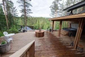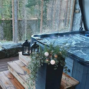 Alakerran katetulla terassilla sijaitsee ulkoporeamme, joka on käytettävissä lisähintaan. Ihaile vaikkapa kirkasta tähtitaivasta tai kuuntele joutsenten laulua samalla lämpimästä vedestä nauttien.